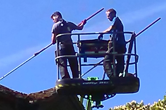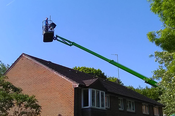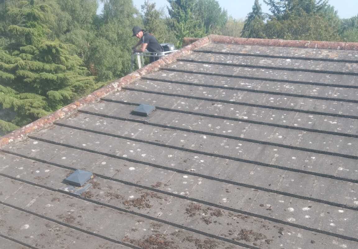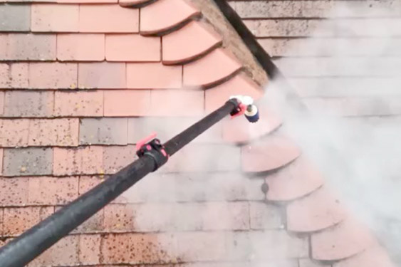 We performed a gentle steam clean to remove moss without damaging the tiles. Access was provided by cherry picker and mobile tower.